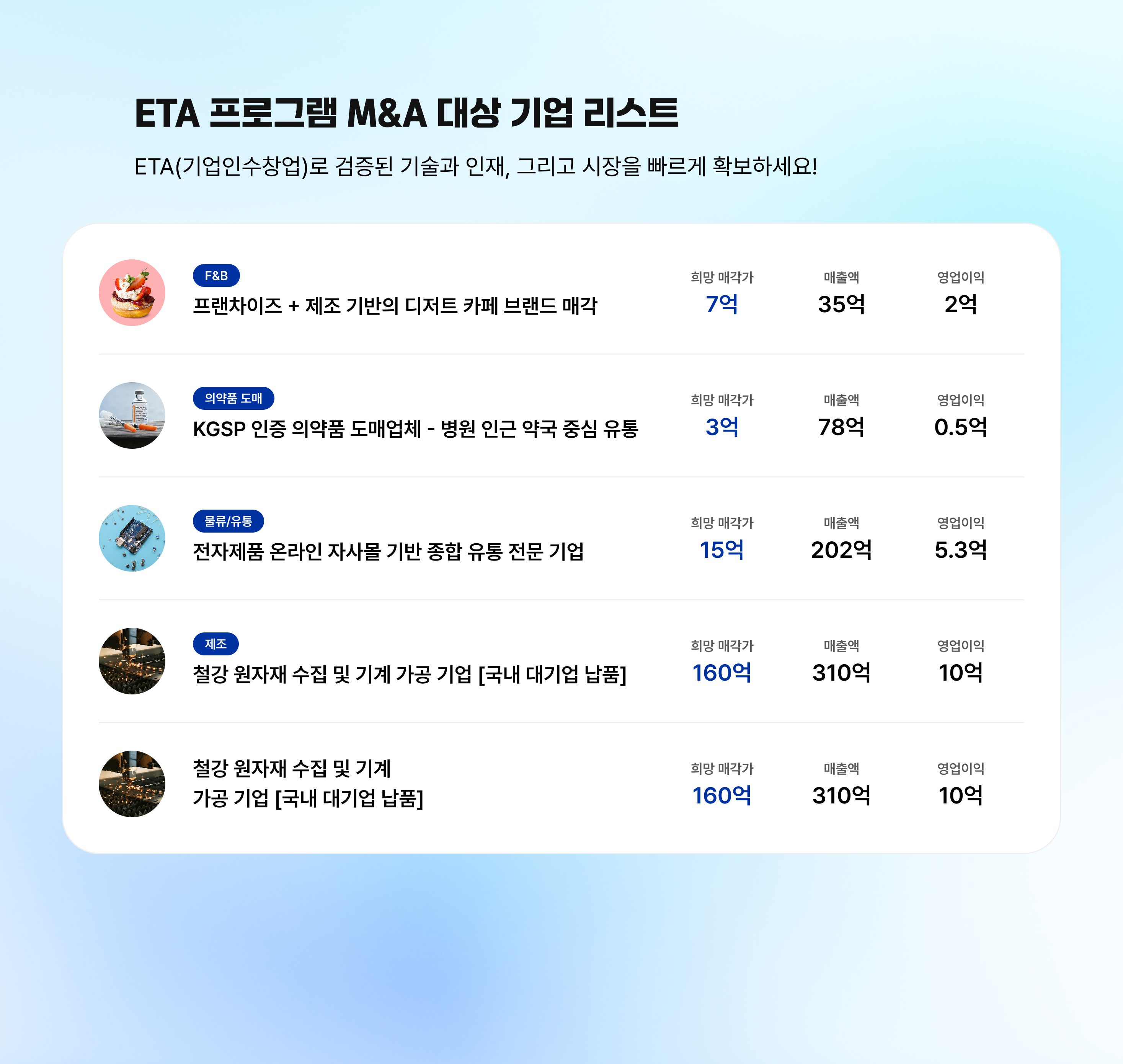 기존 사업과의 시너지를 낼 수 있는 중소기업 인수는 가장 빠르고 확실한 스케일업 전략입니다. 새로운 성장 동력을 확보하여 기업 가치를 극대화하세요.